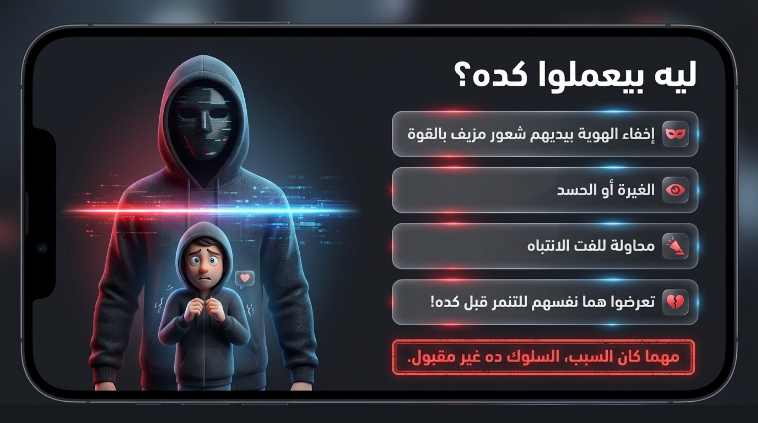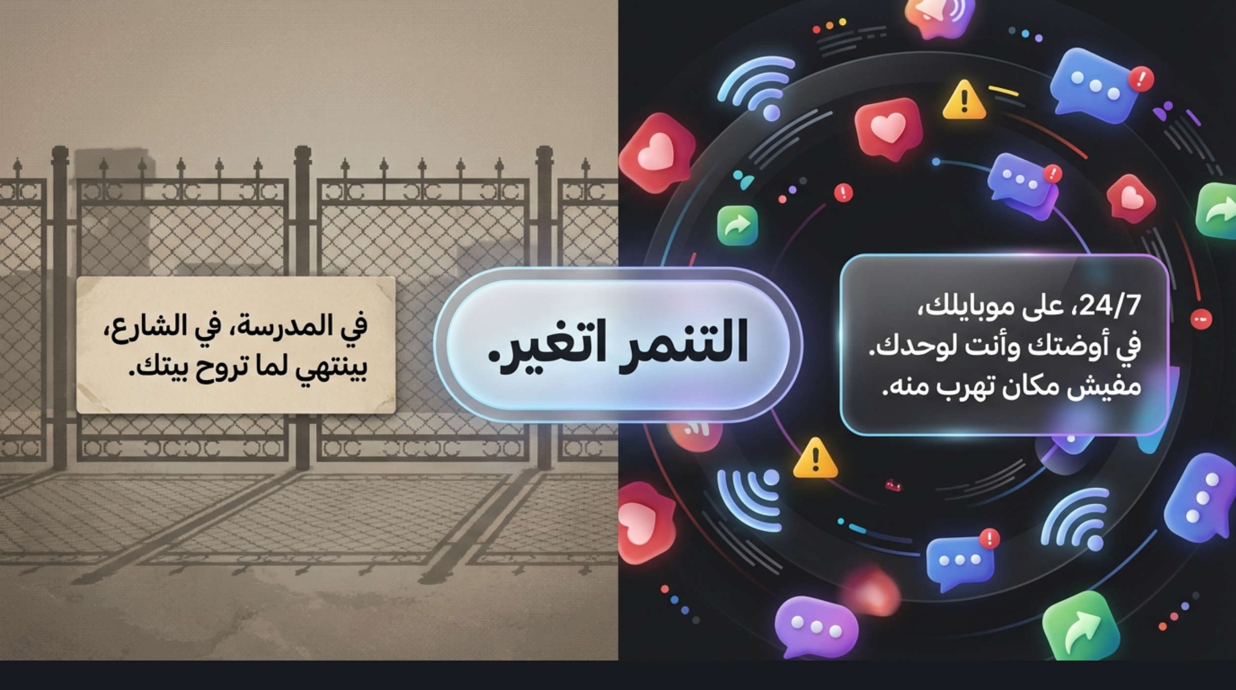 المشكلة إن التنمر على الإنترنت ممكن يوصل للشخص حتى وهو في بيته، أو في غرفته، أو وهو لوحده.